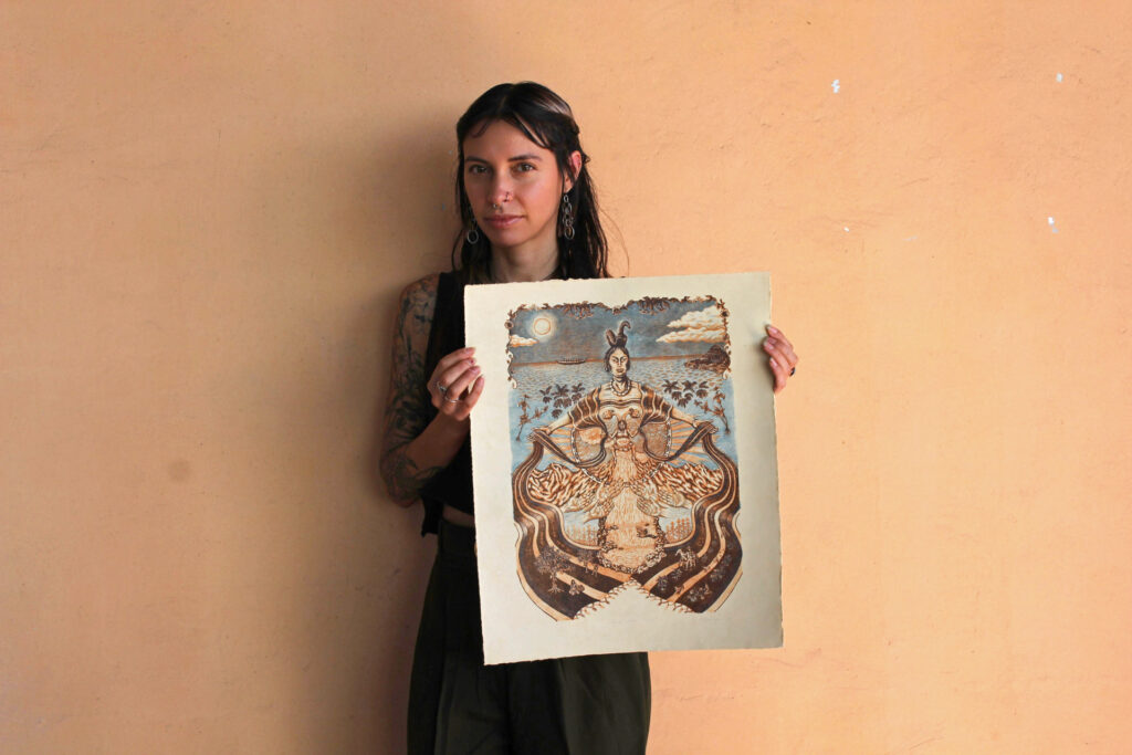 Asenath Lizárraga (b. 1991) is a Peruvian American visual artist raised in Washington state, and currently based in Olympia, WA. Their multidisciplinary art practice and curiosity of the natural world led them to The Evergreen State College where they graduated with dual degrees, a BA and a BS. Asenath primarily works in printmaking and oil painting, using symbolism and detailed overlapping scenes to convey stories exploring cultural connections to nature, magic, ancestry, and dream spaces in between the surreal and reality. They’re passionate about creating art that captures the beauty of Latin American culture, and that emphasizes the many points of cultural unity that exist across this vast continent that they have ancestral ties to.