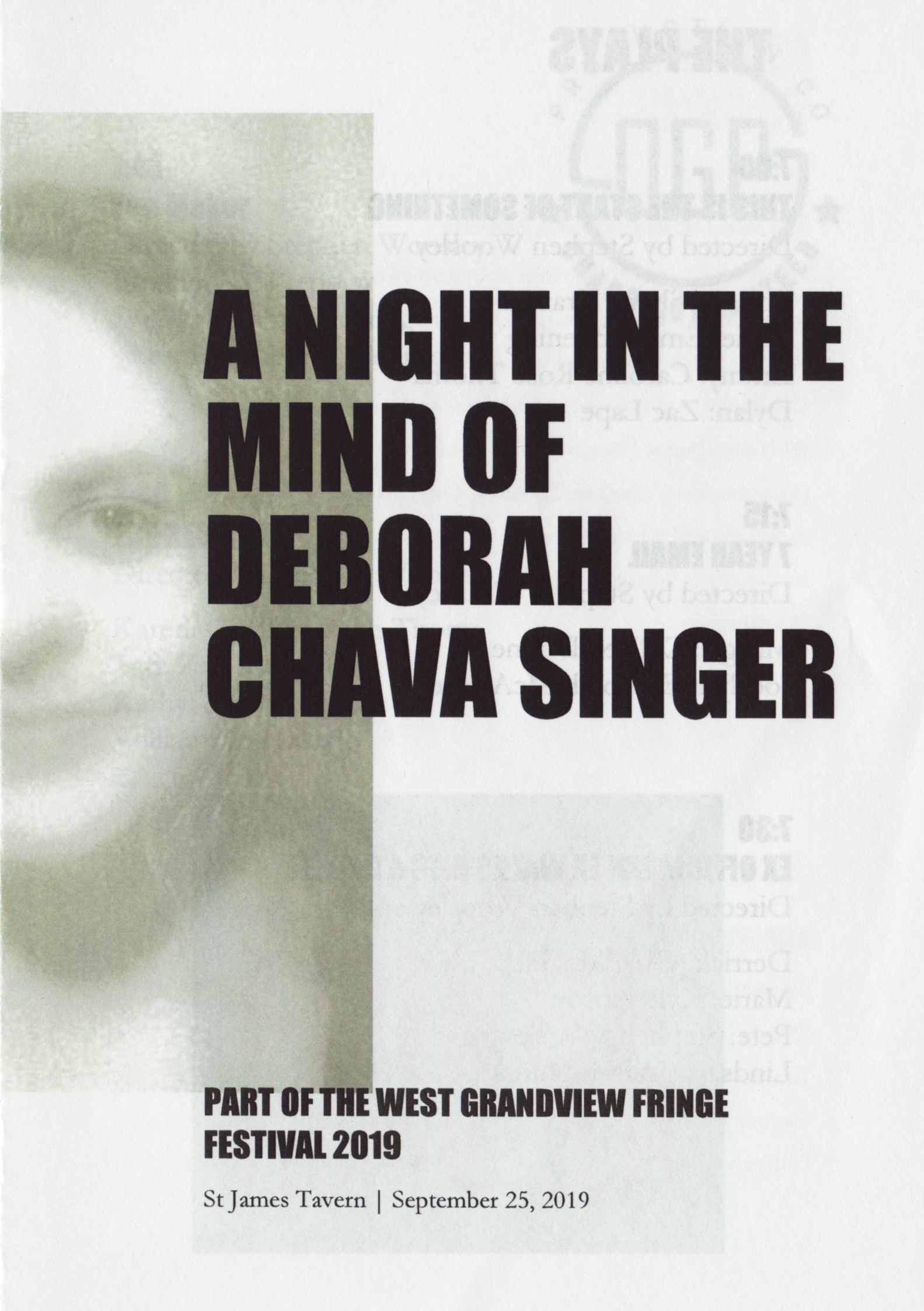 A Night in the Mind of Deborah Chava Singer, Program Cover, OG Productions, 2019, Graphic Design: Emma Peoples, Program Producer: Colleen Dunne