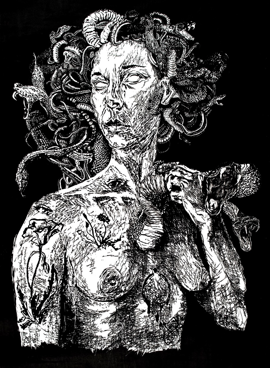 Nikki Jabbora-Barber, Medusa, woodblock, 6 x 4 feet (image) 7 x 5 feet (sheet), 2025. Photo: Nikki Jabbora-Barber