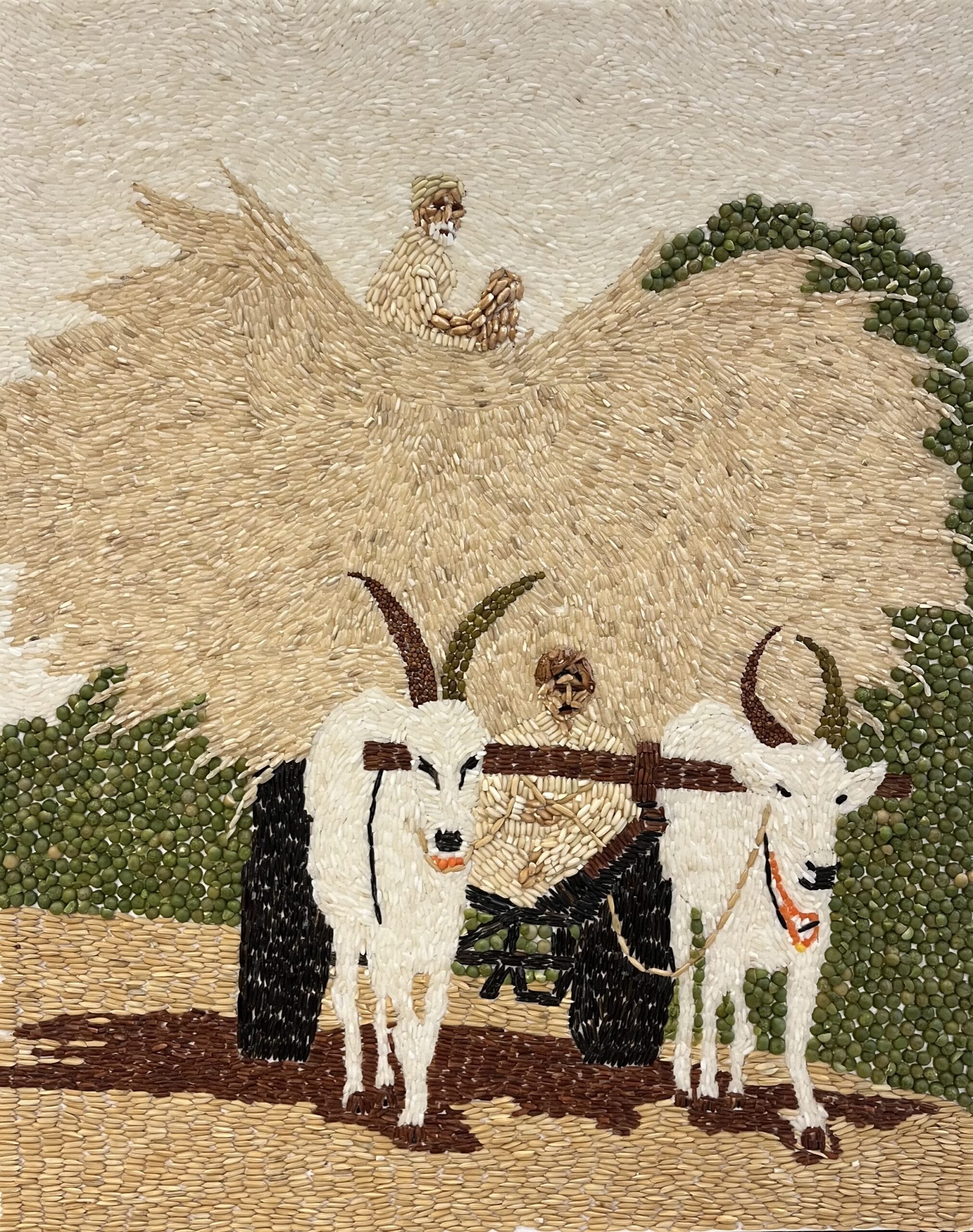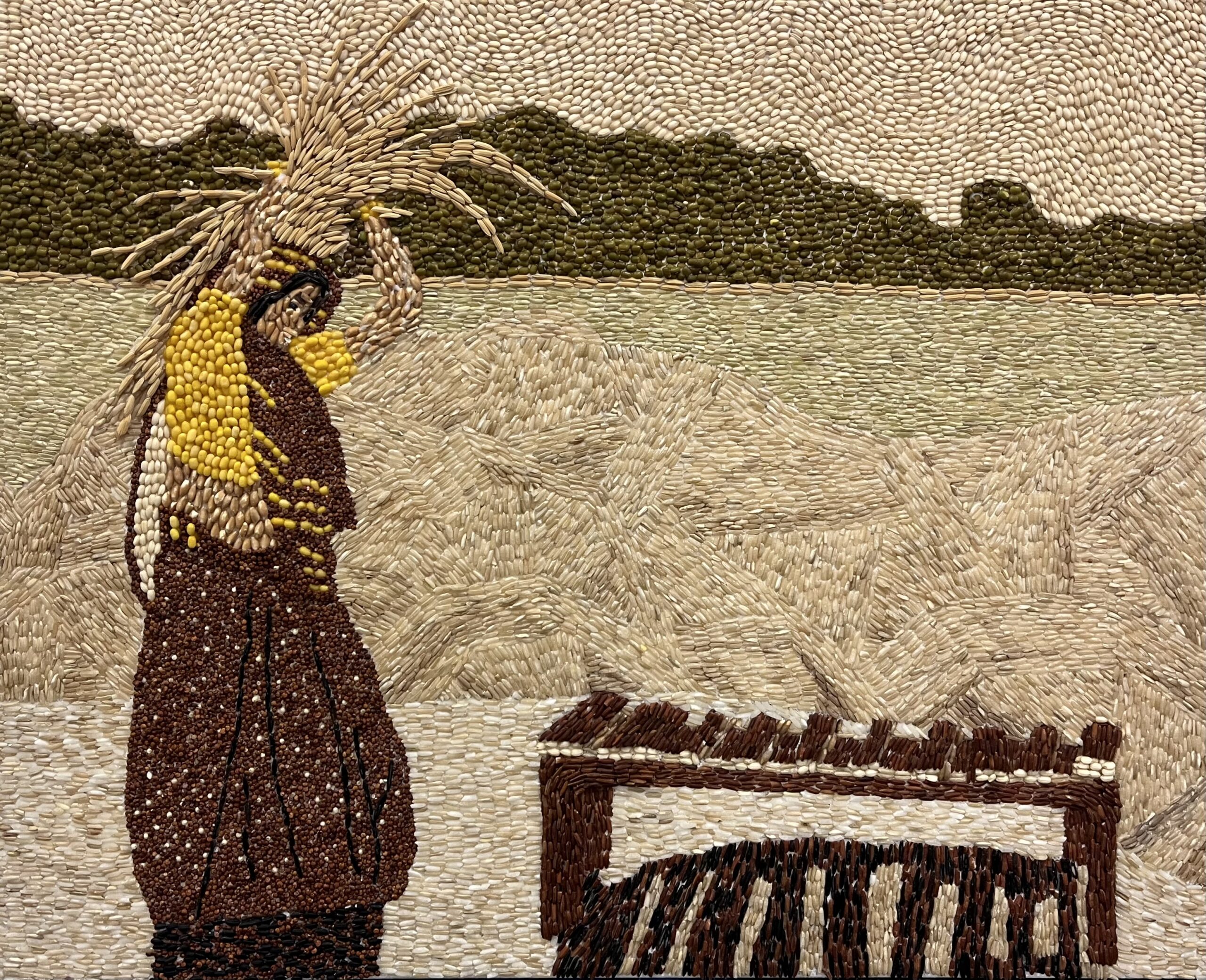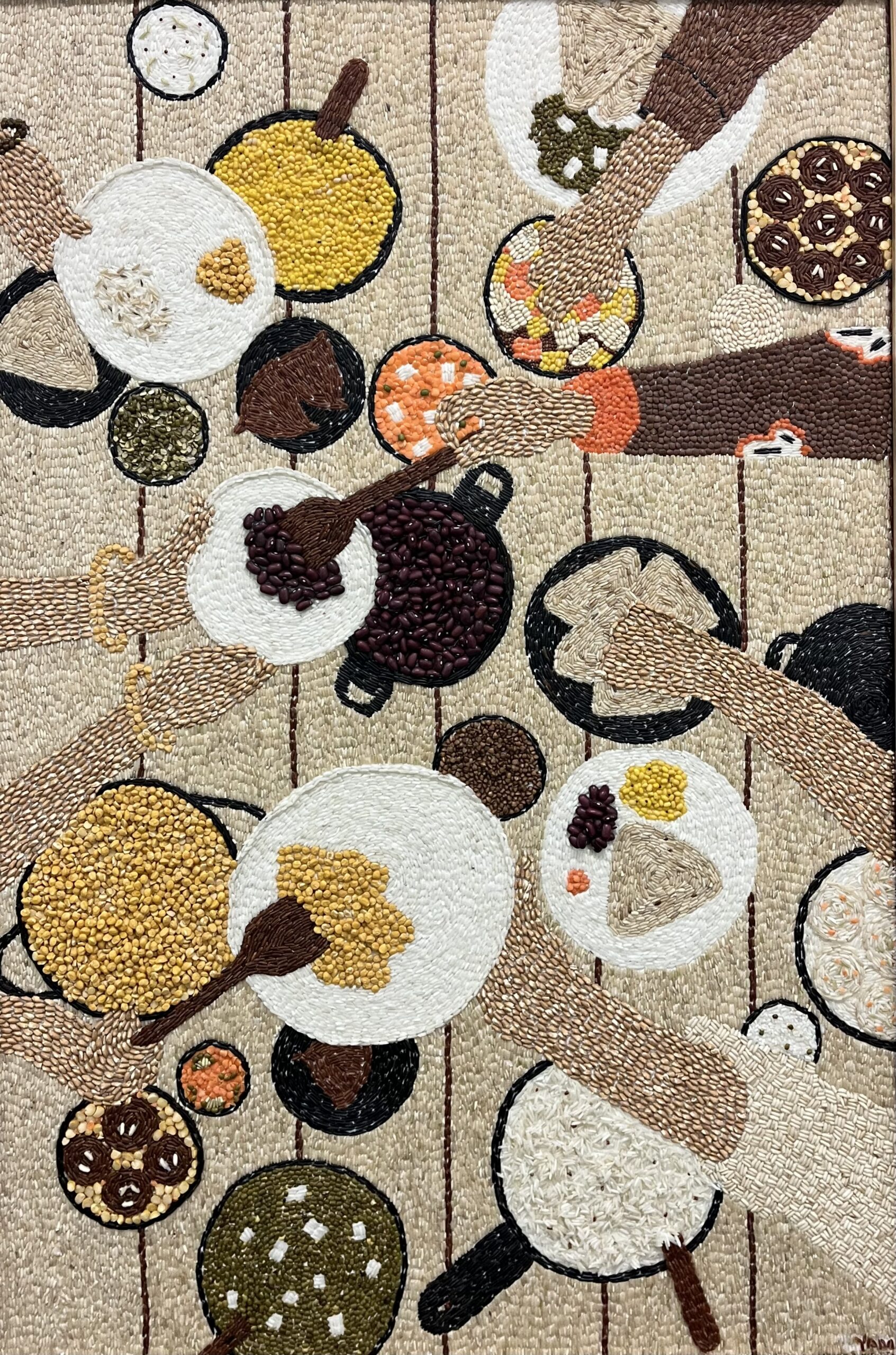 Yaminee (Yam) Patel is a Seattle-based mixed media artist whose work explores themes of cultural identity, food, and community. Inspired by her Indian heritage, Patel utilizes natural materials like rice, lentils, and chickpeas to create intricate, textured pieces that evoke comfort, warmth, and nostalgia. Since starting to share her work publicly in 2023, her artistic journey has been marked by personal accomplishments, such as co-curating “Mundane Dystopia” at Slide Gallery, participating in Shunpike’s 2025 Artist Residency program, and displaying her work in the Shunpike Storefronts program. In 2025 she was awarded a 4Culture arts grant and a GAP grant. She has also had the honor of sharing her work on King5’s New Days NW and in The Seattle Times. Beyond her personal practice, Patel is deeply committed to fostering a vibrant community through art, volunteering at Fishbowl Gallery, working with local youth programs on Public Lands UnEarthed (a BIPOC storytelling project), as well as working with the ACRS local food bank to raise money through art for culturally relevant foods in the International District.